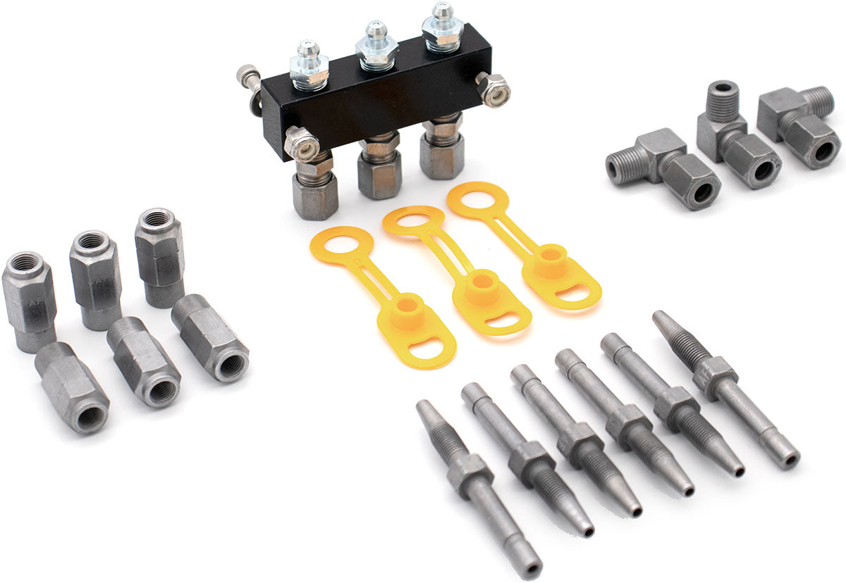 Our kits make it easy to run grease hoses from multiple fittings on your machine to a central grease fitting manifold. By bringing all of your grease points to a central location, you make the task of lubricating the machine faster and easier with less mess and less downtime.