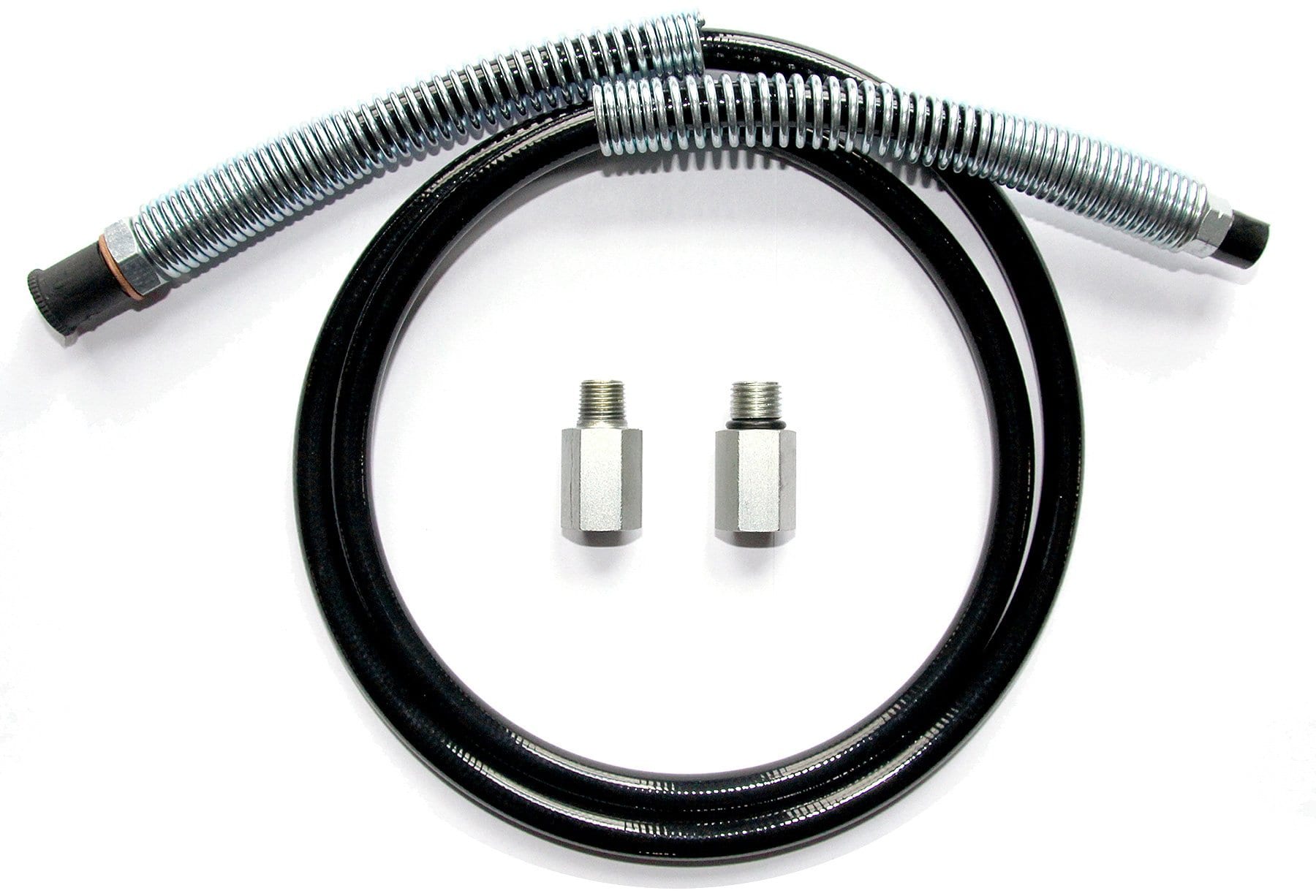 Twin spring guards prevent kinks and cracks and ensure safety with cordless grease guns. A heavy-duty hose with 28,000 PSI burst pressure, and still flexible enough to maneuver easily. 7/16”-28 base end threads compatible with Lincoln and DeWalt®. Included adapters ensure compatibility with all cordless grease guns on the market: 7/16”-20 for Milwaukee®, Ryobi and Alemite, and 1/8” NPT for manual grease guns or other brands’ cordless models. Working end 1/8” NPT male connection for LockNLube® or other grease couplers. No more brand lock-in.
