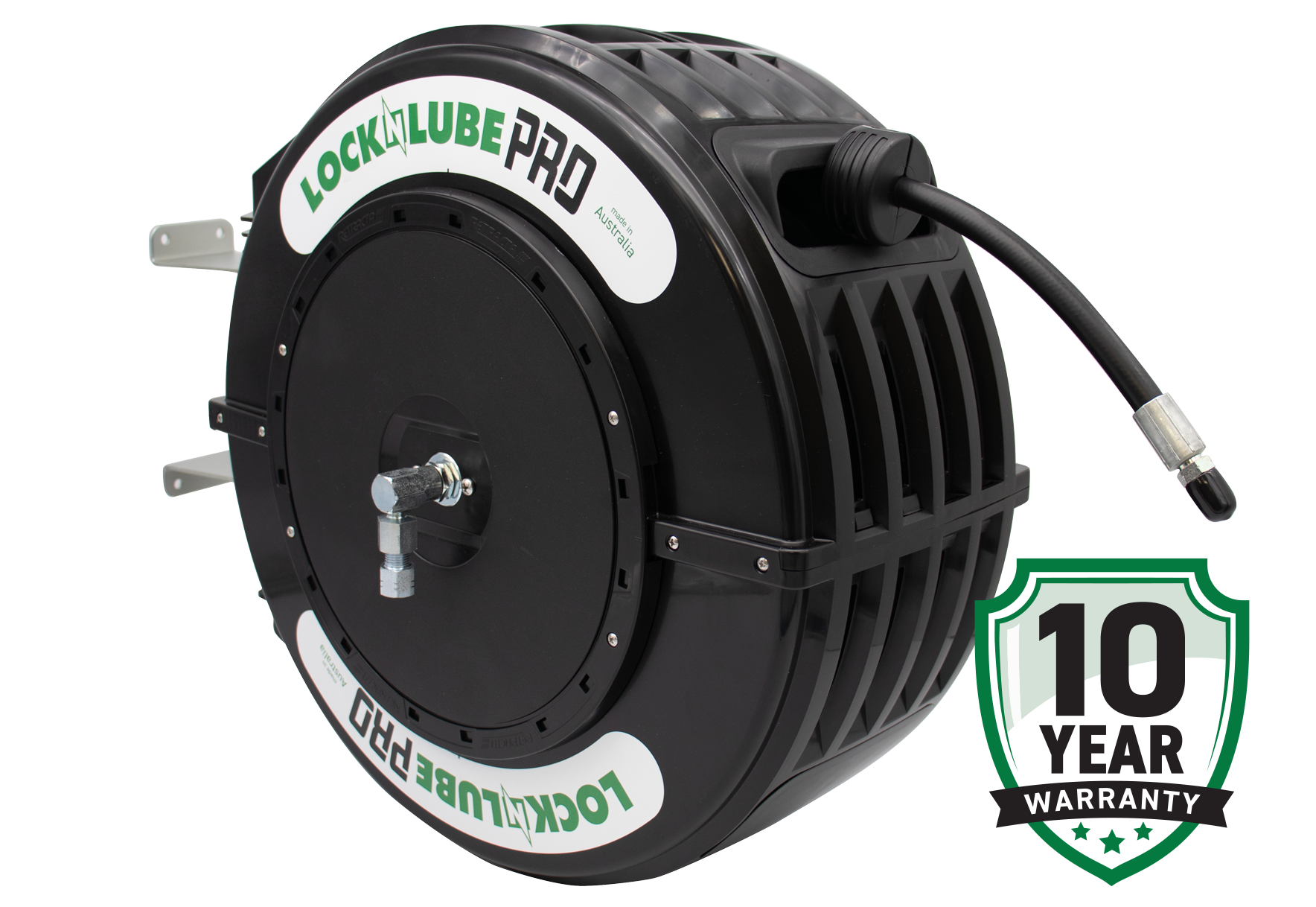 A heavy-duty galvanized steel bracket allows secure mounting to walls, benches, or ceilings, and 1/4" NPT female inlet with 1/4" NPT male outlet connections make setup simple. With a total unit weight of 34 lbs, this reel is fully serviceable, backed by a 10-year warranty, and Made in Australia — Built Outback-tough for years of dependable high-pressure greasing.