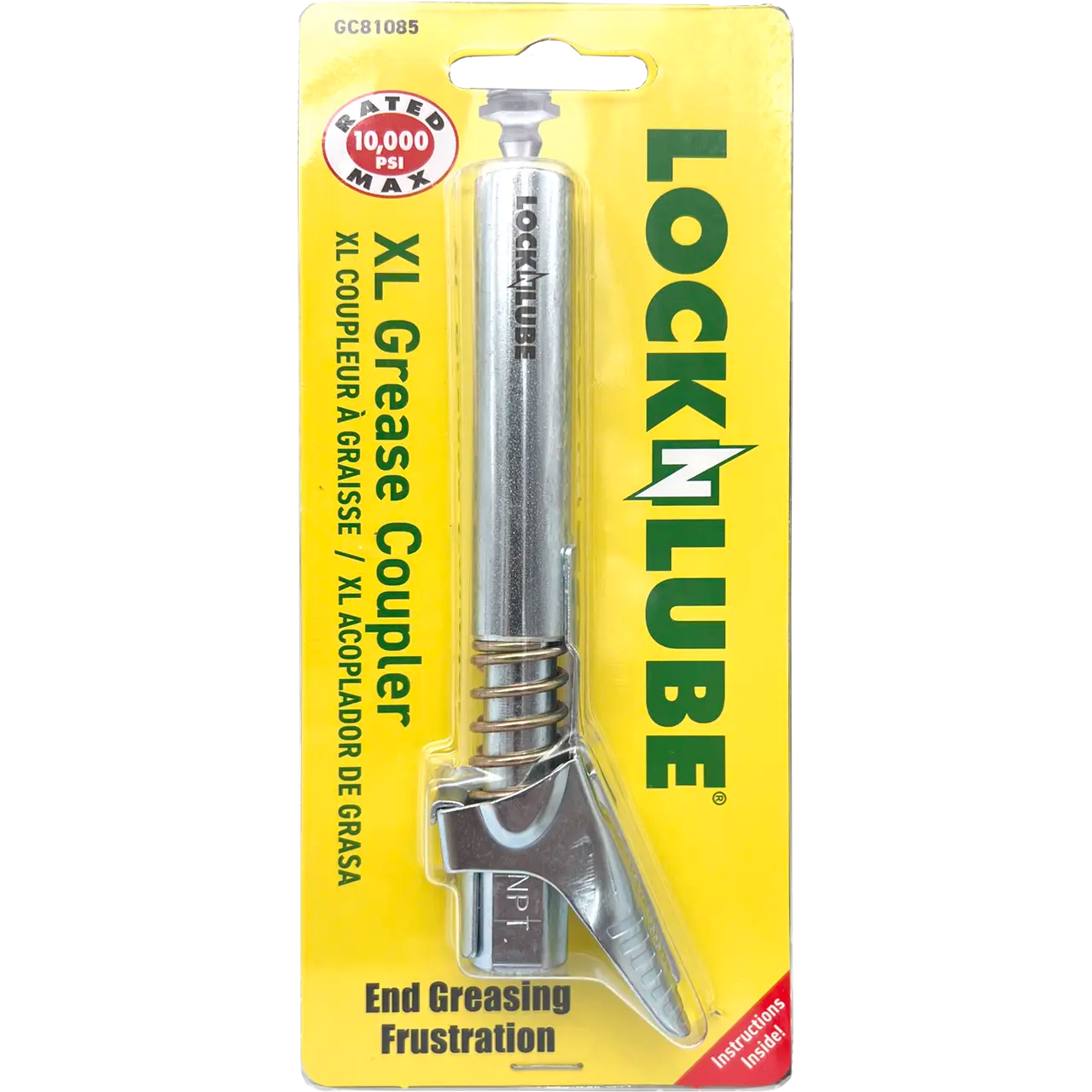 The LockNLube® Grease Coupler XL features almost 4″ of reach, 2″ more than the standard LockNLube® Grease Coupler. Especially suited for deeply recessed fittings, and with the same leak-free, hands-free convenience of the traditional model.