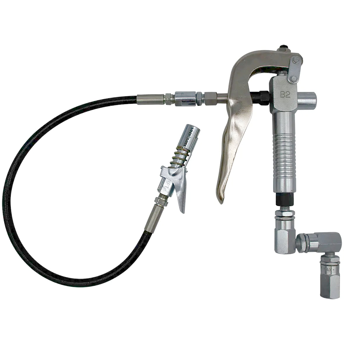 The LockNLube Grease Pump Booster Gun is a high-pressure hose-end dispensing gun designed for use with air-operated greasing systems such as the LockNLube X-Series Grease Pumps, Macnaught Powerlube, and many others.