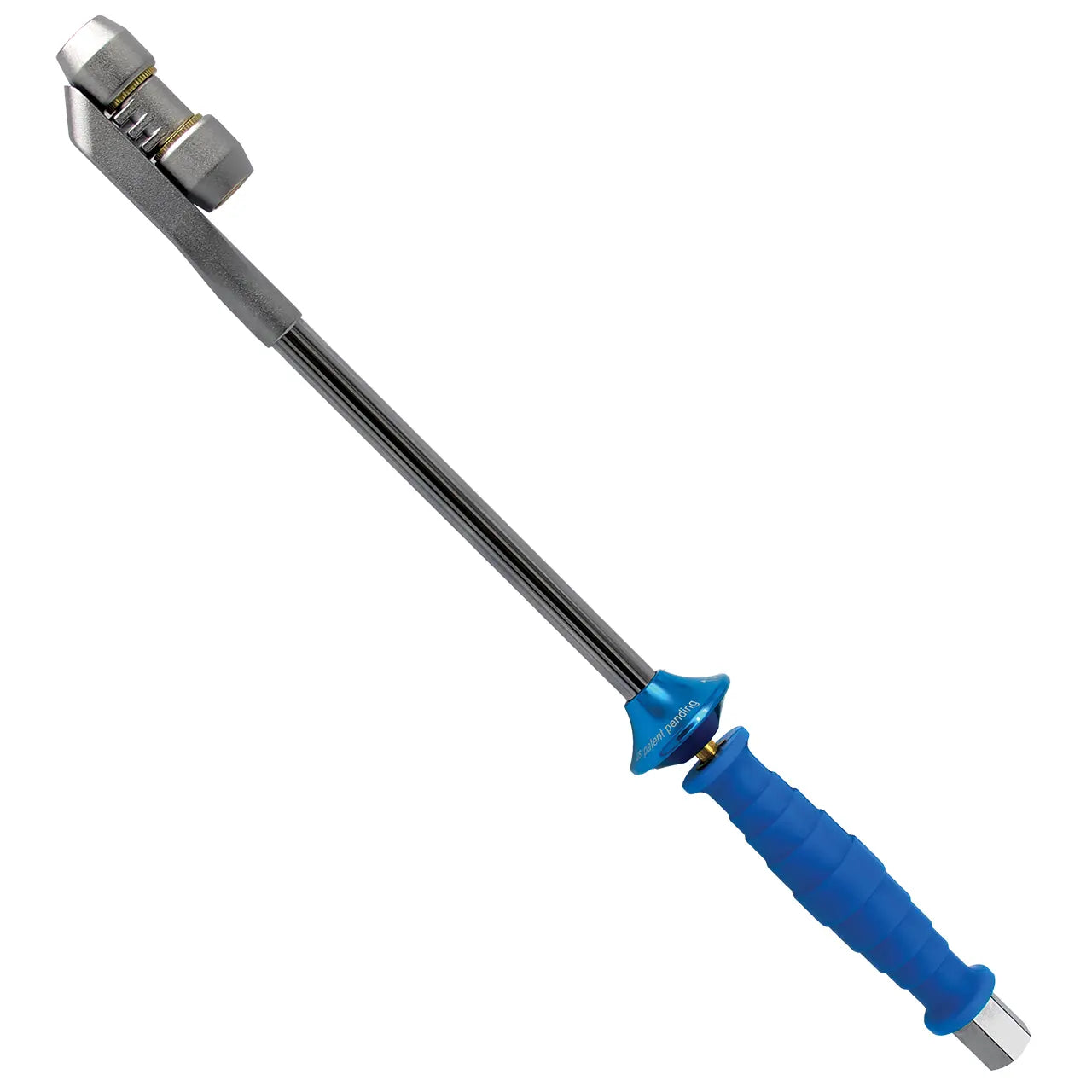 Two-jaw locking design with a completely redesigned reinforced head and patented remote actuator. The updated head construction delivers improved strength, durability, and reliability in demanding shop and roadside environments. Extended reach makes it easy to securely inflate inner dual wheels, while the actuator collar allows safe disconnect without reaching between tires.